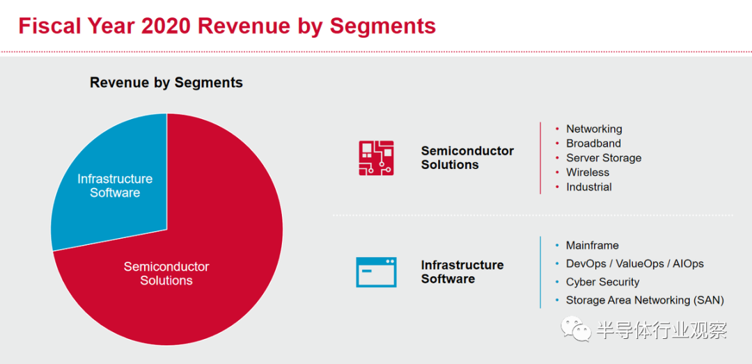 博通的业务专注于为苹果公司的iPhone和其他设备等智能手机生产无线芯片。它还生产用于宽带通信,网络,存储和工业应用的半导体。此外,它在数据中心,大型机和网络安全等领域的基础设施软件业务也在增长。