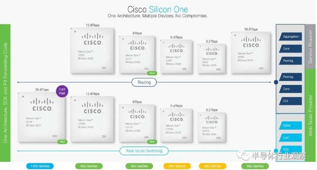 思科是路由先驱和交换机行业的芯片巨头,2019年12月,思科(Cisco)突然宣布对外出售芯片,他们推出了一款Silicon One Q100路由。作为路由先驱和交换机的巨头,思科此举无疑将与博通的这两块业务相抗衡。与竞争对手相比,Silicon One芯片具有更高的性能和更低的功耗。