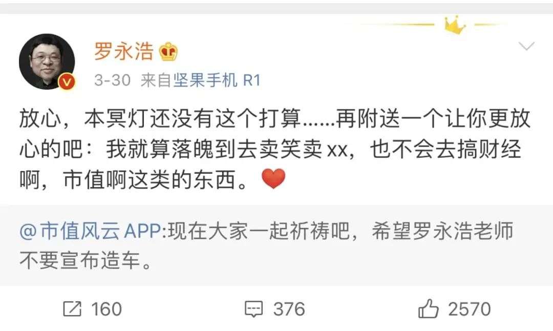 随后罗永浩转发微博回应:「放心,本冥灯还没有这个打算……」