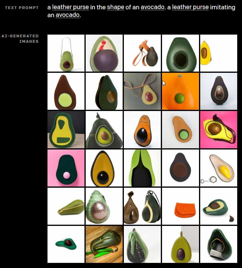 不久前,OpenAI 又发布了名叫 DALL-E 的新系统,这是一种可以基于书面文本自动生成图像的系统。例如,输入文字“牛油果形状的皮革钱包”,该系统就会通过这一指令进行数次迭代,最终生成各类图像。