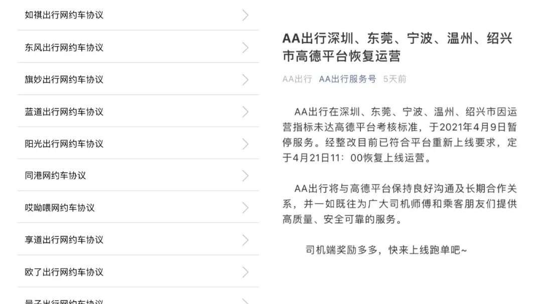 而这也开始引起大型聚合平台的注意,4月9日,AA出行因在上述城市运营指标未达高德平台考核标准,被暂停了业务运营。