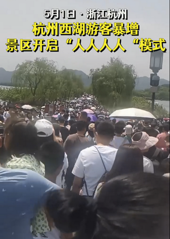 5月1日早上八点左右,西湖即已开启“人从众”模式,断桥变身"人桥",连公厕外也排起百米长的队伍。