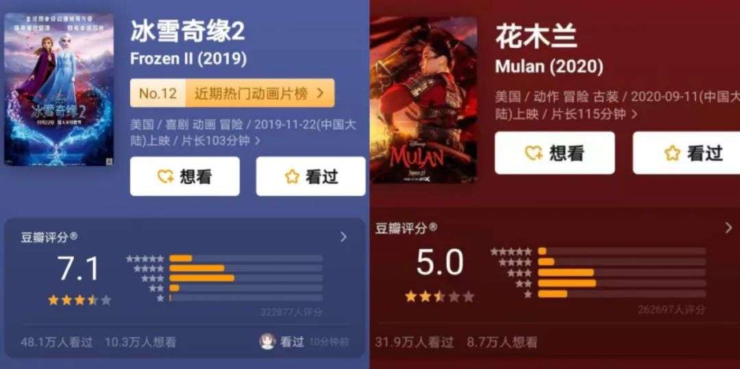 图:冰雪奇缘2、花木兰豆瓣评分(来源:豆瓣)