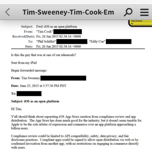 比如,原来 Epic Games 创始人兼 CEO Tim Sweeney 早在2015年就曾给苹果的库克写信,希望苹果开放 iOS 应用分发能力给其它公司;而 Cook 转发邮件给同事询问,“这哥们不是前几天刚在我们发布会上参加过彩排吗?”