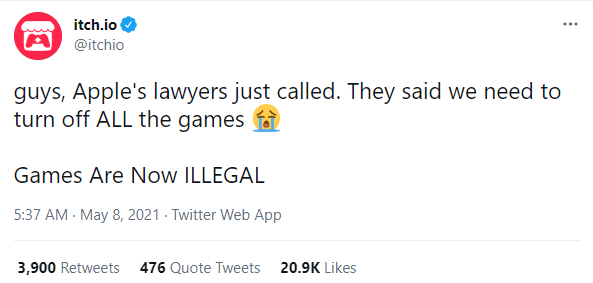 独立游戏平台 itch.io 上周就发推表示,被卷入了 Epic Games 和苹果的法庭斗争当中。