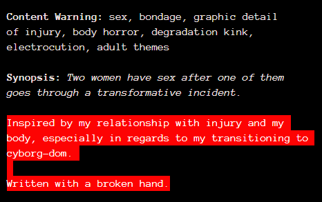 点进去其中一个提交的游戏,会看到: 它的种种“无法在法庭上提及”的成人标签,并非出于开发者的怪癖,而是由自己的身体创伤以及选择的生活方式所启发的。这样的内容不入苹果的法眼可以理解,但阳春白雪和下里巴人都是创意表达,只是形式和对象不同而已,苹果又凭什么在这里扮演卫道士呢?就凭 iOS/macOS 是高大上的操作系统吗?