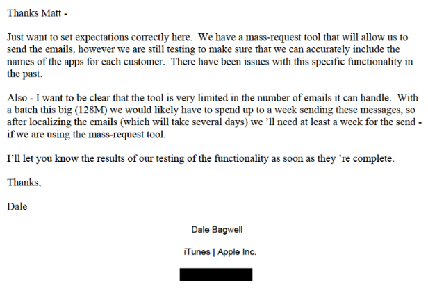 时任 iTunes 用户体验经理的 Dale Bagwell 写道,鉴于此事件影响了上亿用户,”我们的邮件群发工具,发送能力会有很大的限制。如此巨量的通知邮件(1.28亿)可能会需要至少一周。以及,通知邮件的本地化也需要花费数天的时间。“