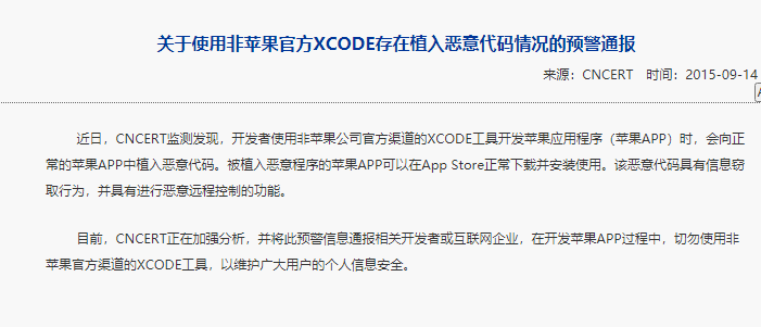 [2] 有关 XcodeGhost 的问题和解答 https://web.archive.org/web/20150925002555/http://www.apple.com/cn/xcodeghost/