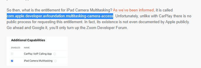 就在 Epic Games 和苹果的案子开庭前,又有一个新的关键案例可能会被原告采用,证明苹果确实没有对开发者一视同仁:有开发者发现,视频会议工具 Zoom 在 iPad 的分屏模式下仍可以激活摄像头正常使用,该功能并非 API 级别,从未出现在苹果的任何公开开发者文档当中。