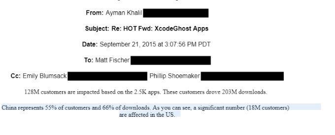 截图来自苹果内部讨论 XcodeGhost 事件的邮件