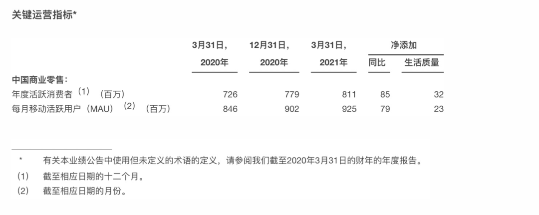 截至3月31日,阿里的年活跃消费者AAC达到8.11亿。一个季度增加了2300万,移动月活跃用户(MAU)9.25亿,70%的新增用户来自下沉市场。