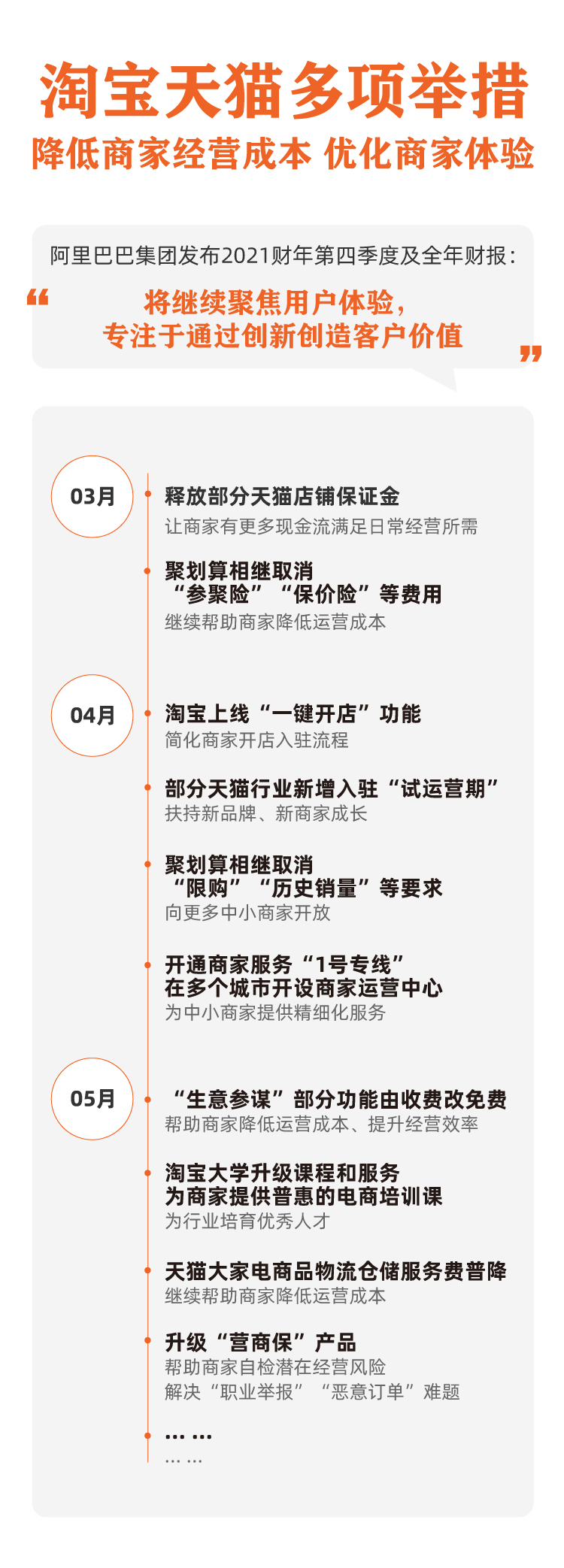 淘宝取消新店铺保证金,商家付费营销工具“三宝一券”(店铺宝、单品宝、搭配宝、优惠券)即将改为免费工具;天猫部分类目开店的规则改为通过7个月试运营能力的考核;淘宝直播坑位费改革,从一口价到按比例结算。接下去阿里会做出更多行动减少商户经营成本,简化营销玩法,让商品价格更直接,物流体验更加确定。