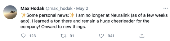 但在不久前,Max Hodak 发推表示,「我已经在几周前离开了Neuralink去接触其他新鲜事物,在这家公司学到了很多东西,虽然不再任职但仍然会为该公司宣传。」
