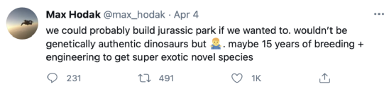 不过,Hodak 虽不像马斯克那样「疯狂」,但是其曾经在社交媒体上表示,目前科学家已经掌握「创造侏罗纪公园的技术」。