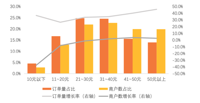 美团研究院数据显示,2019年小吃品类人均消费价格为33.9元,30元以上的订单量占比为54.0%,交易额占比为73.8%,成为小吃品类的主力消费区间,且41~50元及50元以上价格区间的订单量增速较快,分别达到40.0%和45.7%,远高于小吃品类整体35.3%的增速。