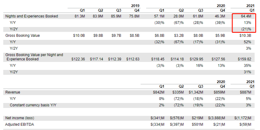 北京时间5月14日凌晨,Airbnb发布了2021年第一季度财报:Q1住宿间夜和体验活动的预订总数为6440万,同比增长13%。