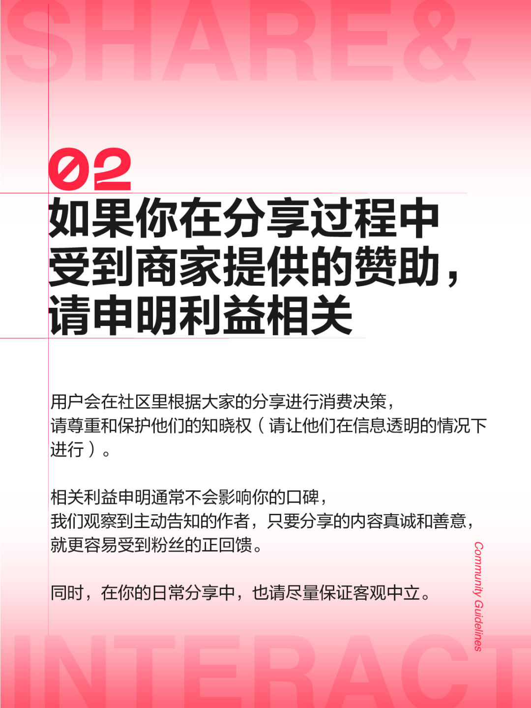 小红书《社区公约》给出了清晰定义,可以总结概括为尊重原创、申明利益相关、抵制炫富,反对伪科学,避免过度修饰,不要冒充他人等11条内容。