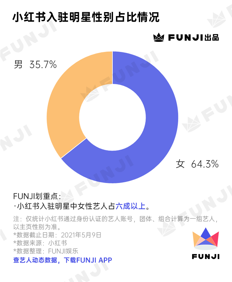 作为以年轻女性为主要目标群体的生活方式社区,小红书的女性用户高达八成。大概与平台定位相关,来小红书发展的艺人也多为女性。在1301位入驻明星里,男艺人仅占35.7%,而女艺人有64.3% ,几乎为男艺人数量的2倍。