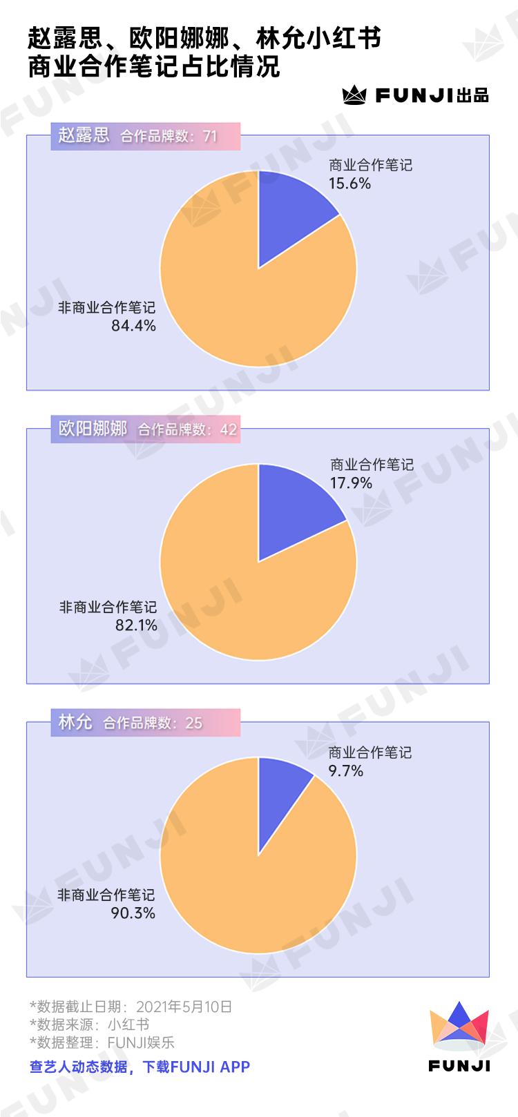 FUNJI以赵露思、欧阳娜娜、林允三位在小红书较为活跃的艺人为例,统计了她们主页的商务合作笔记数据情况。