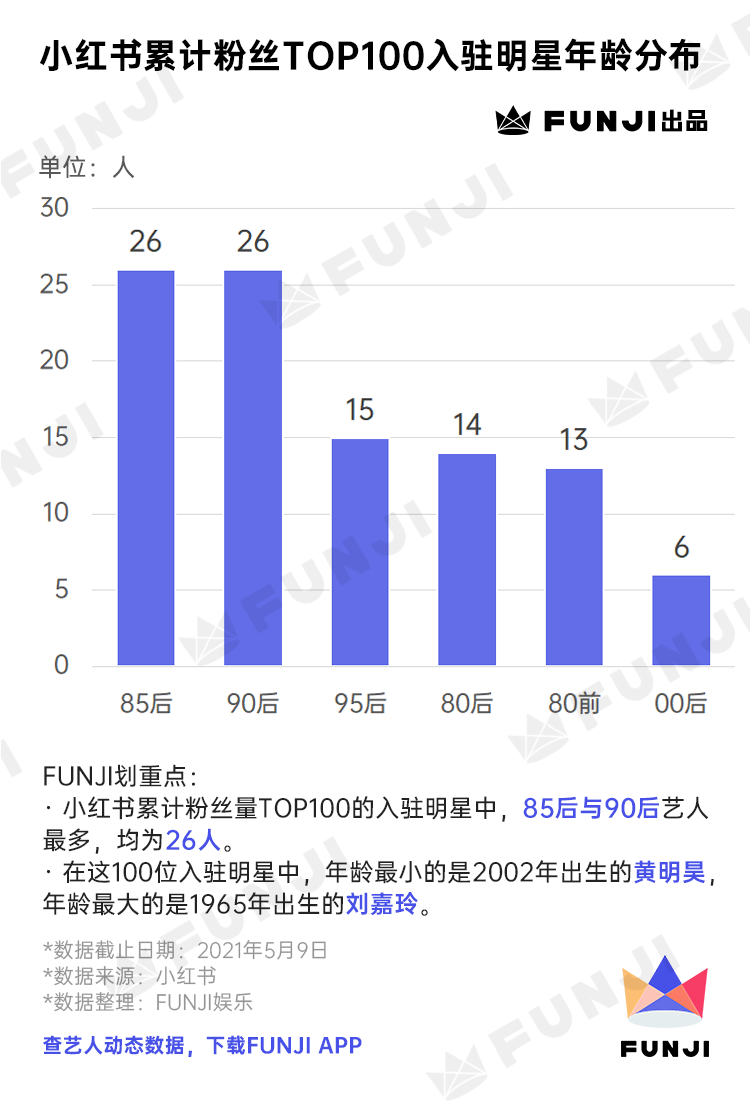 虽然小红书的用户群体越来越年轻化,但在小红书上受欢迎的艺人却是百花齐放。FUNJI统计了小红书累计粉丝TOP100的入驻明星,得到了如下年龄分布: