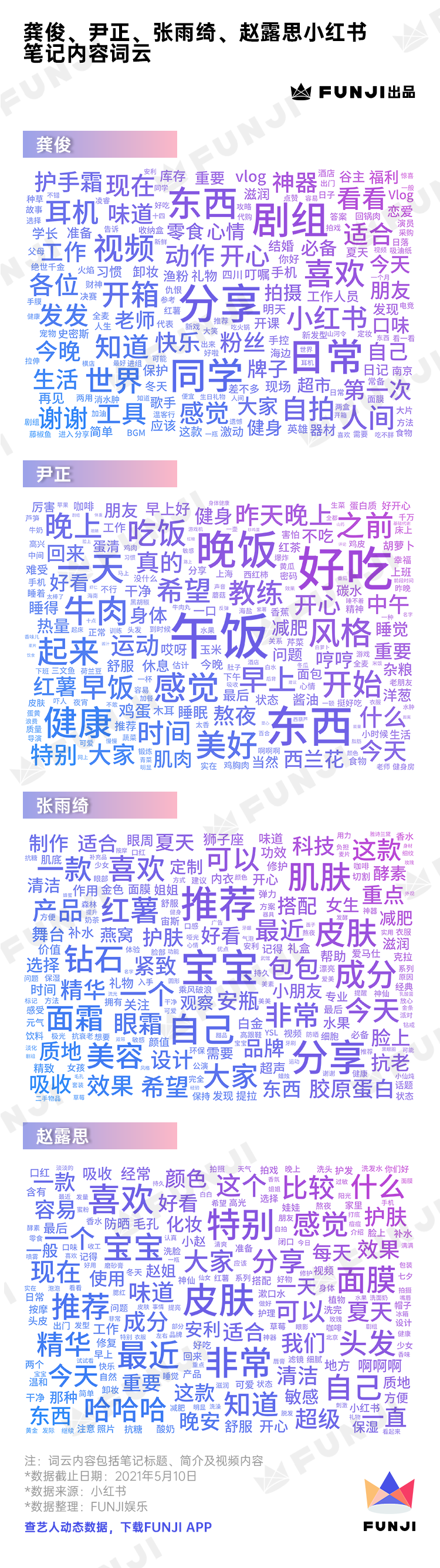 在这里,他们更加真实自由,也更加放松亲近。FUNJI统计了龚俊、尹正、张雨绮、赵露思四位艺人的小红书笔记词云,能够更直观地看出他们在发什么。