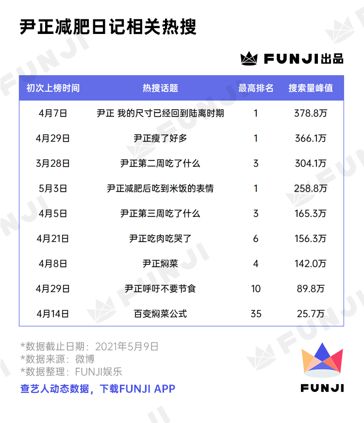 而尹正的减肥日记也火到了小红书外,成为了让许多网友追更的连续剧。截止到5月10日,就已经有9个相关话题登上了微博热搜。