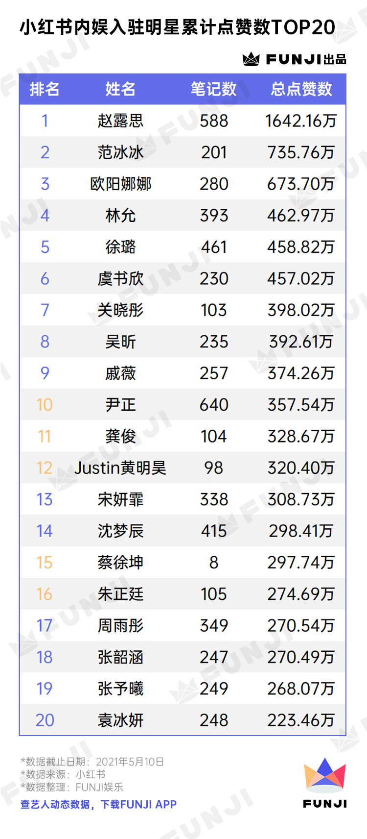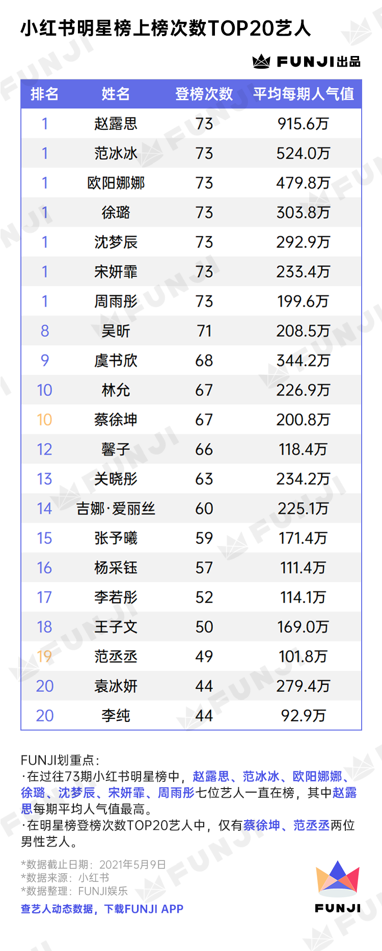 FUNJI抓取了过往73期的小红书明星榜,统计了登上榜单次数最多的艺人。