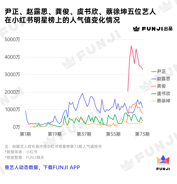 虽然小红书主要是年轻女艺人的战场,但从近期的人气值来看,则是尹正称霸明星榜,并且实现了持续断层。
