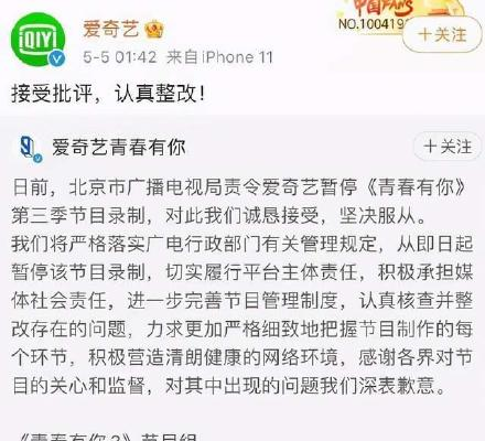 5月9日,《青春有你3》按广电“责令”终止节目录制后,除“因身体原因退赛”的余景天外,其余19位练习生均在站姐注目下离开录制地大厂。
