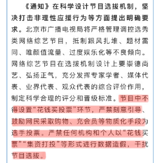 本次,北京市广播电视局在《关于进一步加强网络视听节目管理工作的通知》中提出选秀类网络综艺节目不得设置“花钱买投票”环节,是对2020年《网络综艺节目内容审核标准细则》的重申。