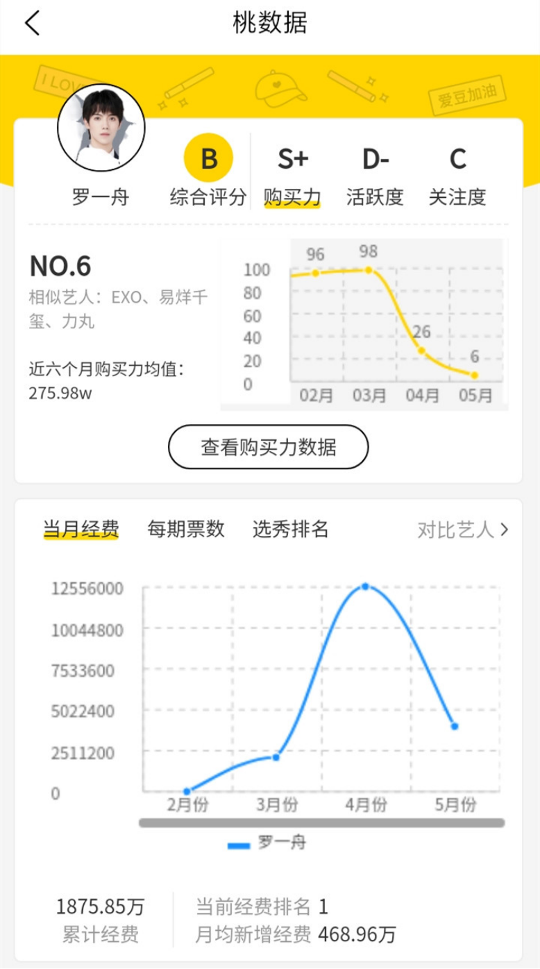 根据桃叭数据统计,《青春有你3》票数排名第2的参赛选手罗一舟,比赛期间,粉丝公开累计打投经费1875.85万,月均新增经费468.96万。由于节目中止录制,罗一舟最终并未出道,换而言之,粉丝花出去的1875.85万,打了水漂。