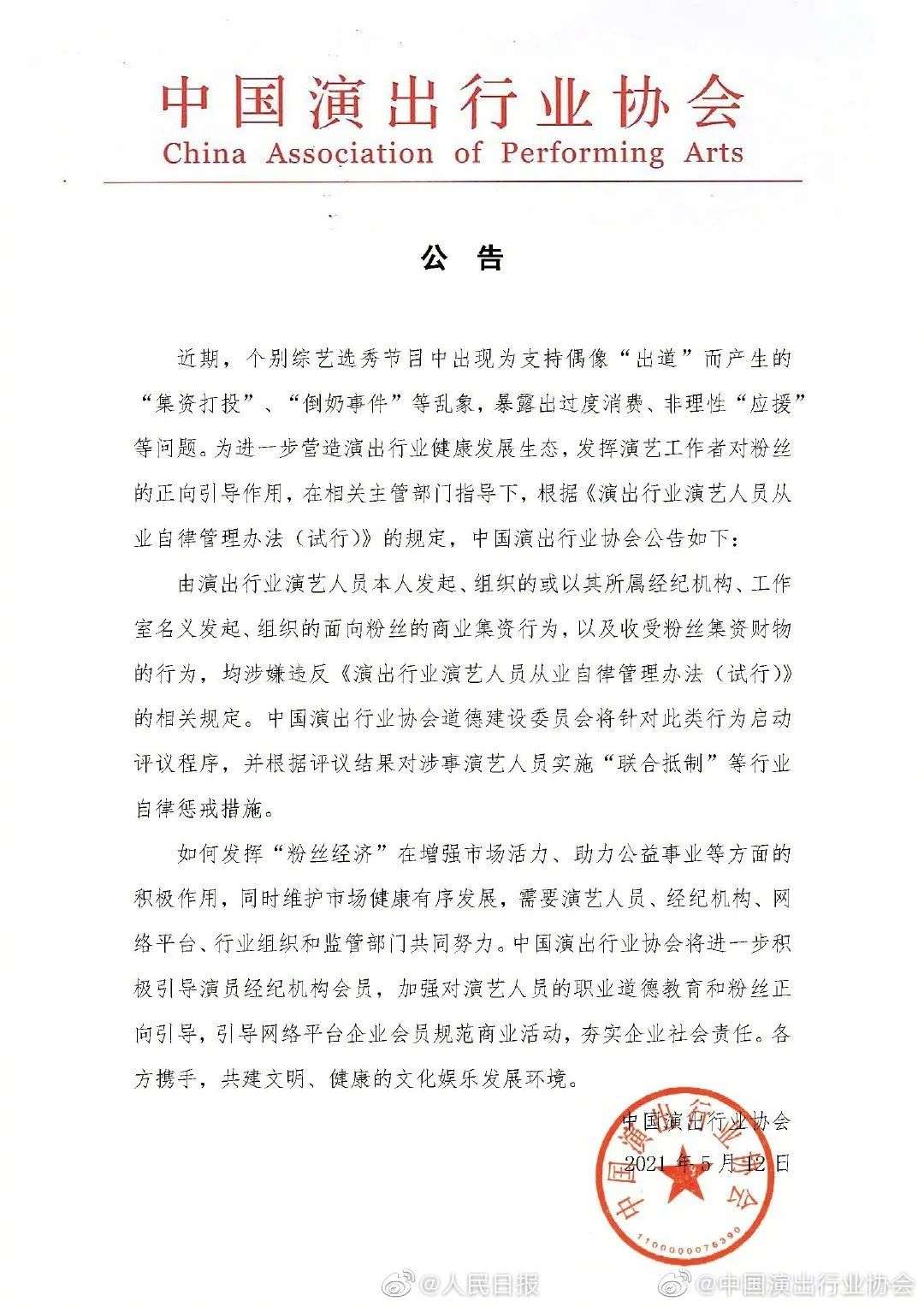 5月12日,继官媒点名“倒奶打投”、广电宣布选秀节目严禁设置花钱买投票环节、网信办开展清朗专项行动后,中国演出行业协会再次出手,提出将对向粉丝集资的明星艺人、经纪机构实施“联合抵制”等行业自律惩戒措施。