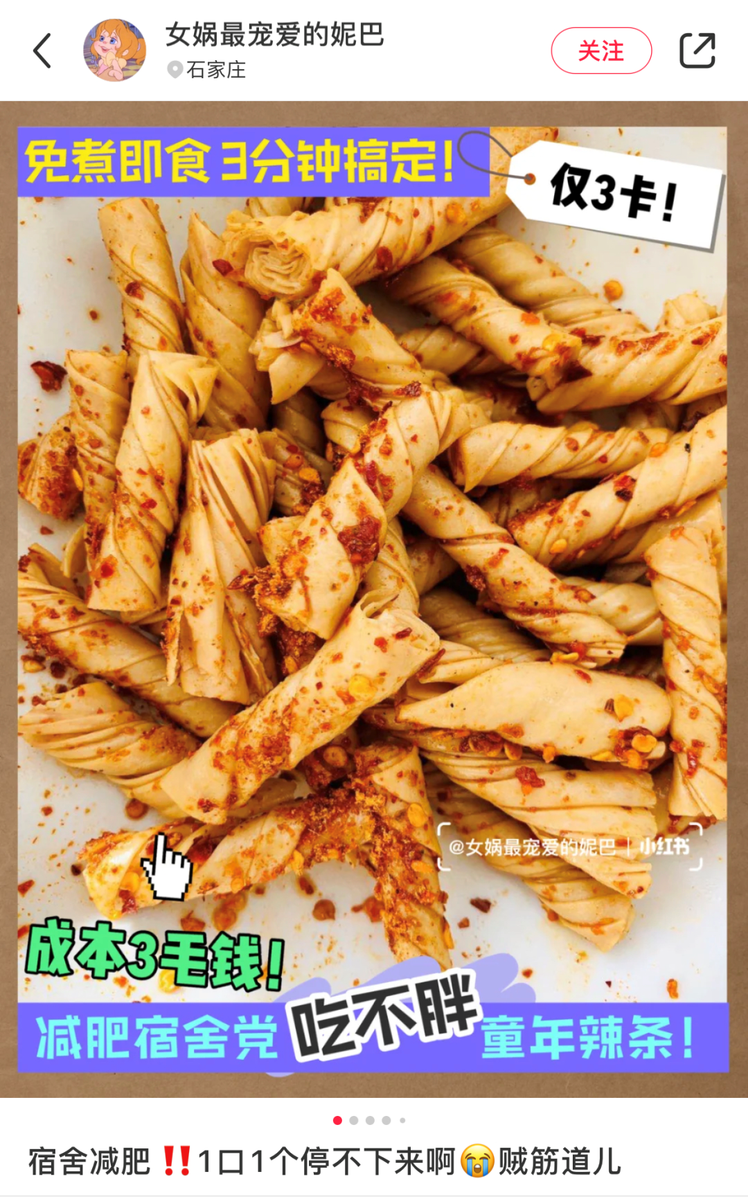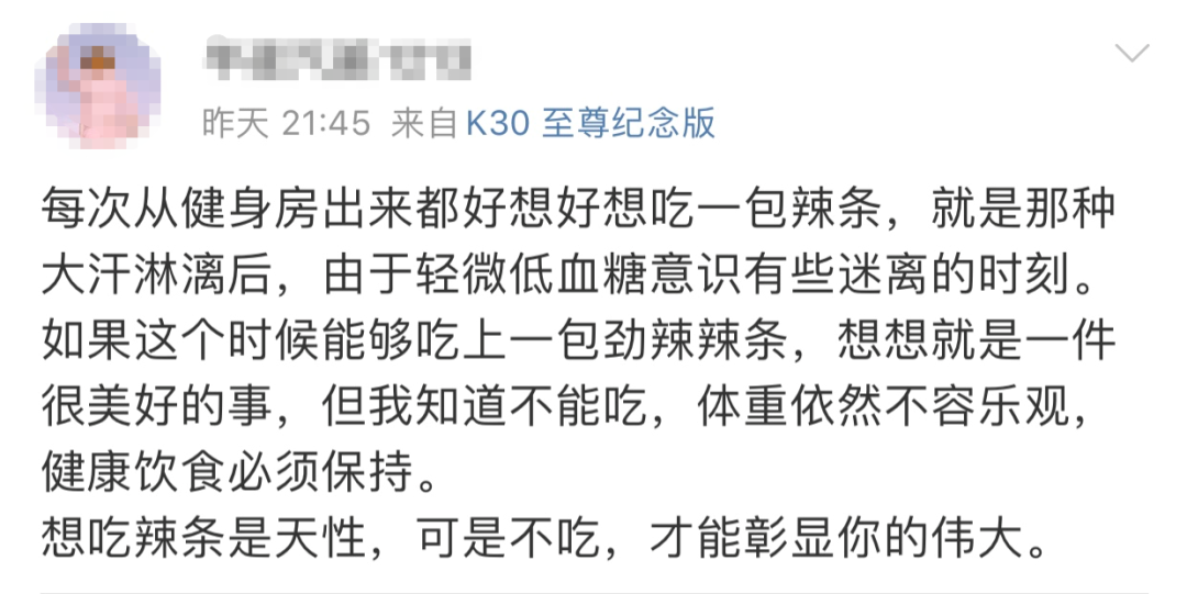 “化整为零”也是减脂达人推崇的方式,既然大分量停不下来,那就分小袋吃。成功者总是少数,失败者低估了辣条强悍的成瘾性: