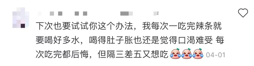 或者自虐灌水法,即使喝到涨肚也要坚持将辣条吃完,然后不得不沉溺在快乐之后的贤者时间。