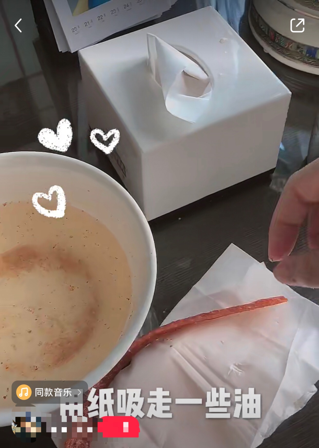 妹子为了找到含油量最少的辣条试吃7、8款,在痛并快乐中找到最“清爽”的那个,巧用婴儿专用餐巾纸,努力把油光水滑的辣条吸成大列巴。