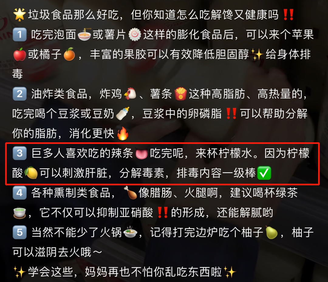 我试验了一下,能否排毒是门玄学,但柠檬水真是个解辣、爽口又刺激食欲的好东西,喝完我又吃一袋。