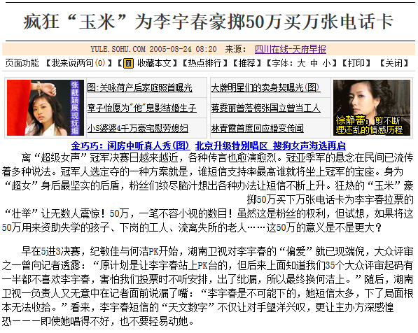 2005年的夏天,为了让李宇春在《超级女声》的总决赛中获胜,狂热的“玉米”(李宇春粉丝昵称)曾豪掷50万买下万张电话卡为其拉票。
