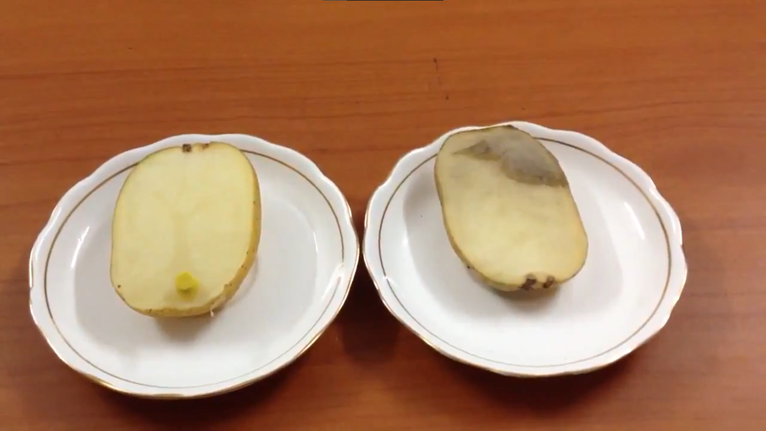 把土豆置于空气中数小时,左侧土豆因涂抹了柠檬汁表面没有发生变化,而右侧的土豆则开始氧化褐变 / YouTube
