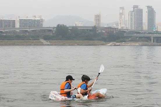 2014年9月28日,韩国大学生乘薯片筏渡江反对食品袋充气过多 / WSJ