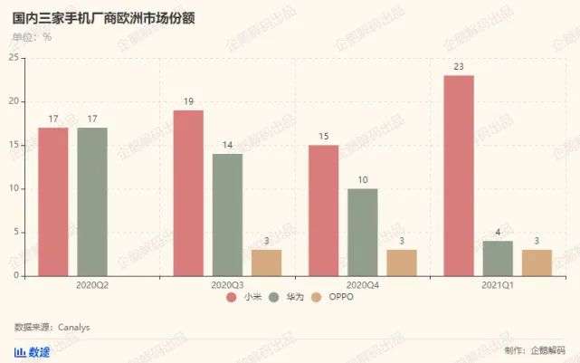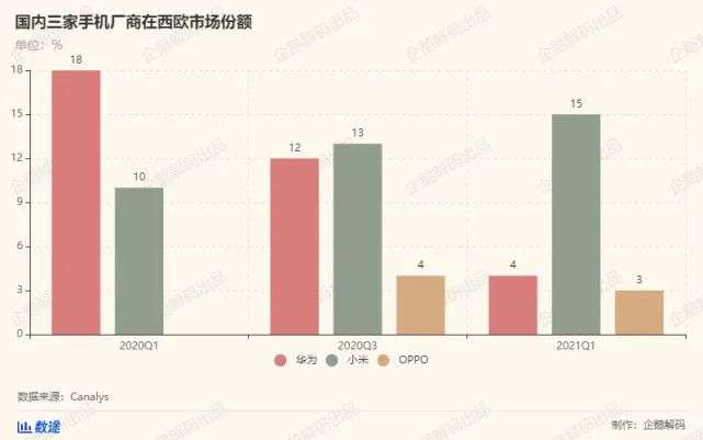 西欧市场同样如此,Canalys有限的数据显示,去年一季度,华为的市场份额还达到了18%,小米为10%,一年之后,小米的市场份额就达到了15%,OPPO也以3%的市场份额直接华为。