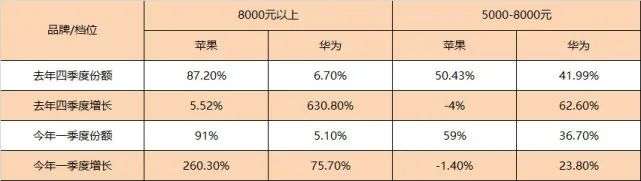 位于5000元-8000元区间的高端市场同样如此,苹果的市场份额从去年第四季度的50.43%增长到了59%,华为则从41.99%降到了36.7%。