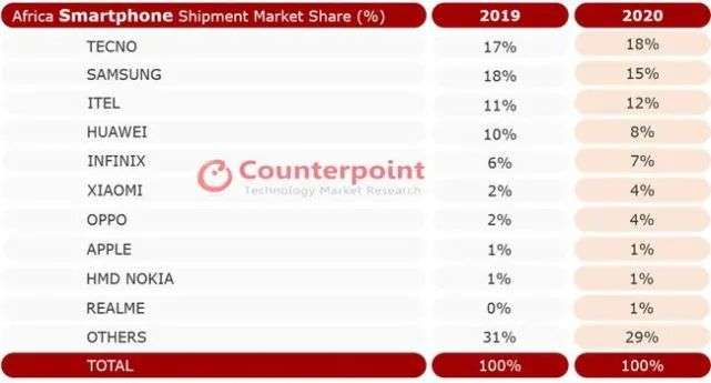 从目前来看,非洲算是华为为数不多发展较为平稳的市场。Couturepoint数据显示,2020年全年,华为在非常市场的份额为8%,排名第四,而上一年则为10%,下滑幅度并不大。
