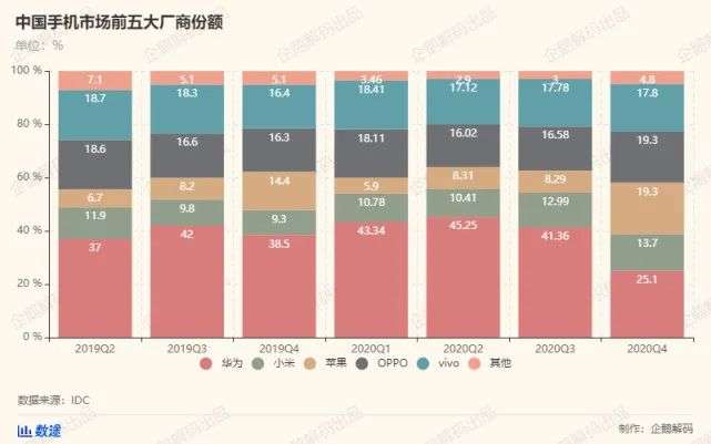 从过去两年国内手机市场的份额占比来看,除了华为一家独家大之外,没有任何一家手机厂商的份额超过20%,即使苹果在每年销售最旺的第四季度,也没有突破这一数字。