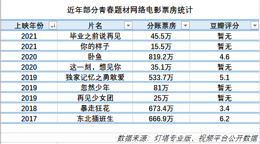 在“爆款”出现之前,青春片还没有成为市场大类时,大部分出品公司都会稳妥地选择回避掉这个方向。青春片何时能在网络平台以新的面貌复苏,还需要在情节、节奏、用户等诸多方面继续探索。
