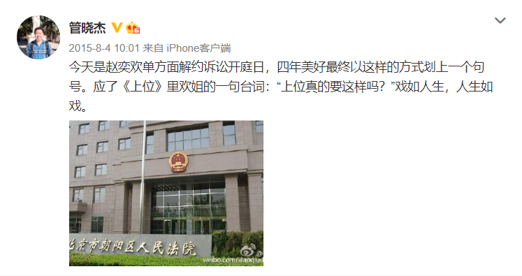 然而此时赵奕欢却突然中止了与管晓杰的合作,有业内人士透露两人关系破裂。2015年管晓杰执导的《玩的就是艳遇》上线,没能达到预期中的影响力,关于该片的负面评论多为“根本没有赵奕欢”。