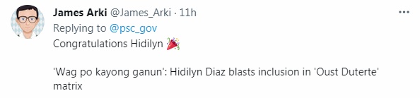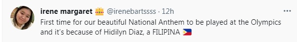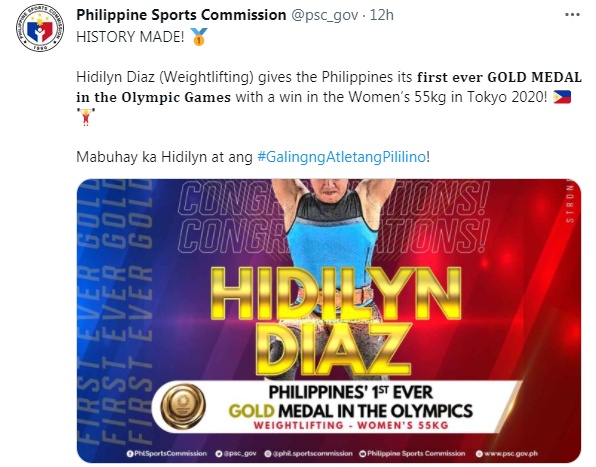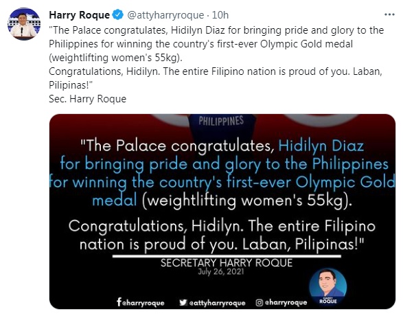 迪亚兹为菲律宾摘得该国史上第一块金牌,总统府也发来贺电。报道提到,总统杜特尔特发言人哈里·洛克祝贺说,“整个菲律宾民族都为你骄傲。”“马拉坎南宫(总统府)祝贺希德林·迪亚兹为菲律宾赢得了历史上第一块奥运金牌(举重女子55公斤级),为菲律宾带来了骄傲和荣耀。恭喜你,希德林。整个菲律宾民族都为你骄傲。”洛克在推特上写道。