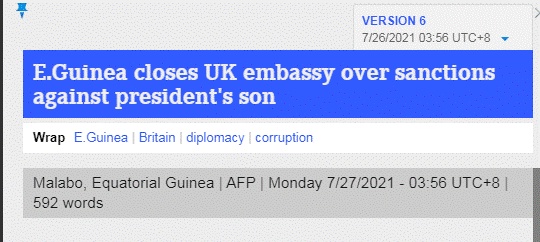 据法新社报道,赤道几内亚26日以英国“干涉其内政”为由,关闭了赤道几内亚驻伦敦的大使馆,此前英国宣布制裁赤道几内亚总统特奥多罗•奥比昂•恩圭马•姆巴索戈之子。