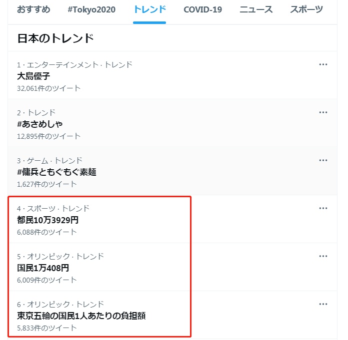 这篇文章随即引发日本民众的关注与热议。“市民103929日元”、“国民10408日元”、“东京奥运会给每位国民带来的平均负担”等关键词冲上日本推特热搜榜。↓