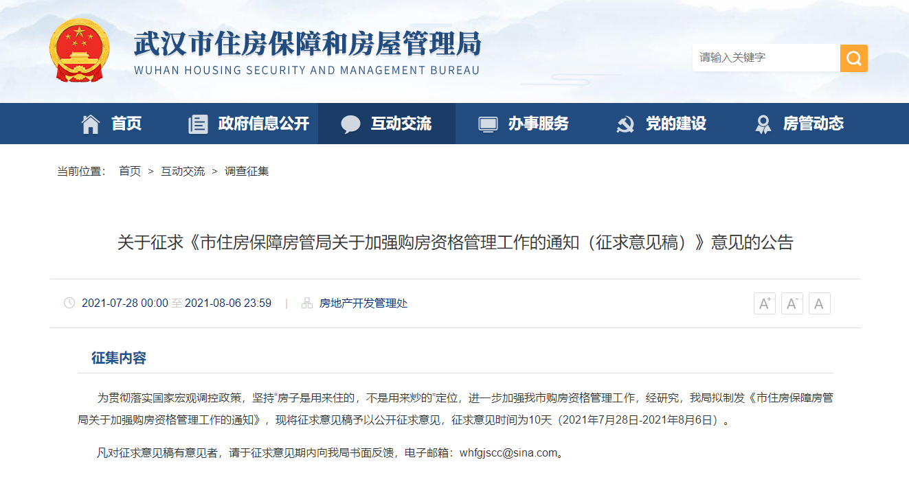 28日,武汉市住房保障和房屋管理局发布《武汉市住房保障房管局关于加强购房资格管理工作的通知(征求意见稿)》(以下简称“意见稿”),征求意见时间为10天(2021年7月28日-2021年8月6日)。