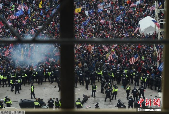 图为美国国会大厦圆形大厅外聚集的特朗普支持者。